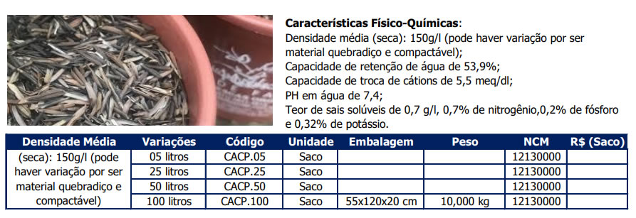 Da fração orgânica temos: 50% de celulose, 26% de lignina e 4% de outros componentes como óleos e proteínas. A alta concentração de lignina e celulose impede o processo de decomposição da casca de arroz e reduz a biodisponibilidade dos outros compostos da casca de arroz. A decomposição orgânica da casca de arroz só é possível em meio aeróbico na presença de certos fungos específicos. Sobre condições anaeróbicas, como na compostagem, a casca de arroz não irá se decompor. O processo de carbonização da casca de arroz foi identificado como método ideal para contornar o problema de excesso de lignina e celulose. A casca de arroz carbonizada (CAC) é resultante da combustão incompleta da casca de arroz sobre alta temperatura e condições de baixo oxigênio (pirólise). A pirólise causa a decomposição da lignina e da celulose liberando resíduos de carbono, sílica e outros minerais. As cascas de arroz podem ser carbonizadas e usadas como substrato, em canteiros ou recipientes, na germinação de sementes e formação de mudas de vegetais superiores.Utilização: A casca de arroz carbonizada hoje é um dos melhores substratos para horticultura, hidroponia, frutíferas e ornamentais. Pode ser usada como substrato em canteiros e recipientes, por exemplo no cultivo de pitaya, pepino, em slab para cultivo de morango, orquídeas, mistura para germinação, enraizamento de estacas e formação de mudas, para suculentas e semeadura geral, tem demonstrado ótimo resultado misturado com Turfa de Sphagnum.