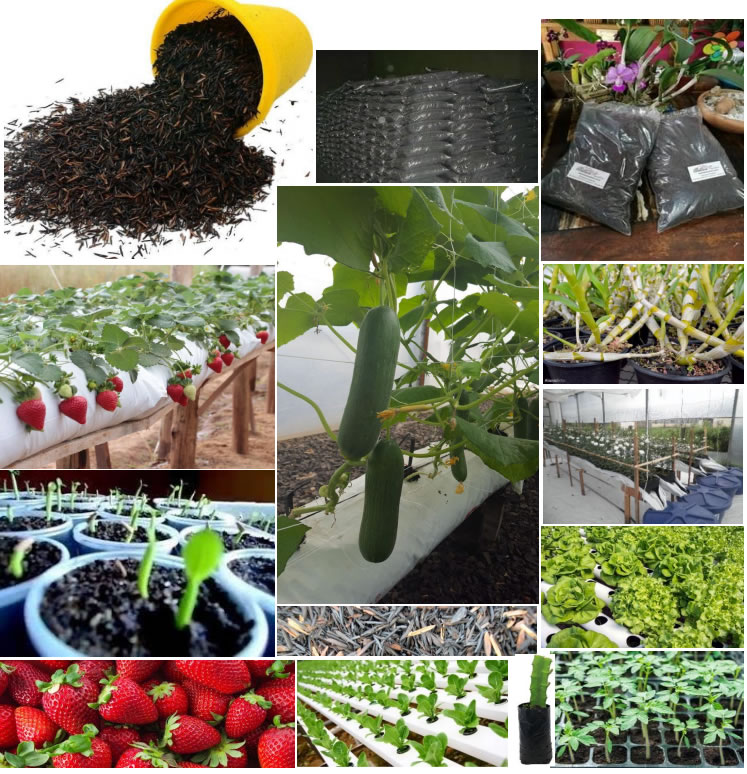 Vantagens:As cascas de arroz carbonizadas são consideradas um bom substrato para germinação de sementes e enraizamento de estacas por apresentar as seguintes características: Permite a penetração e a troca de ar na base das raízes; É suficientemente firme e densa para fixar a semente ou estaca; Sendo indicada para germinação de sementes, enraizamento de estacas e também para cultivo hidropônico e semi-hidropônico; Tem coloração escura e forma sombra na base da estaca; É leve e porosa permitindo boa aeração e drenagem; Tem volume constante seja seca ou úmida; É livre de plantas daninhas, nematoides e patógenos; não necessita de tratamento químico para esterilização, em razão de ter sido esterilizada com a carbonização; É bastante resistente à decomposição, isso traz a vantagem de reutilizar substrato; Possui alta porosidade e aceita a mistura de outros elementos (turfa, húmus, vermiculita, etc); O progresso da plasticultura (SLABS) exige otimização do substrato de horta. Solos orgânicos, como turfa, são empregados internacionalmente como material-padrão para a composição do substrato, entretanto, podem apresentar limitações para uso, como excessiva retenção de água e baixos valores de pH. Casca de arroz carbonizada pode corrigir tais limitações.