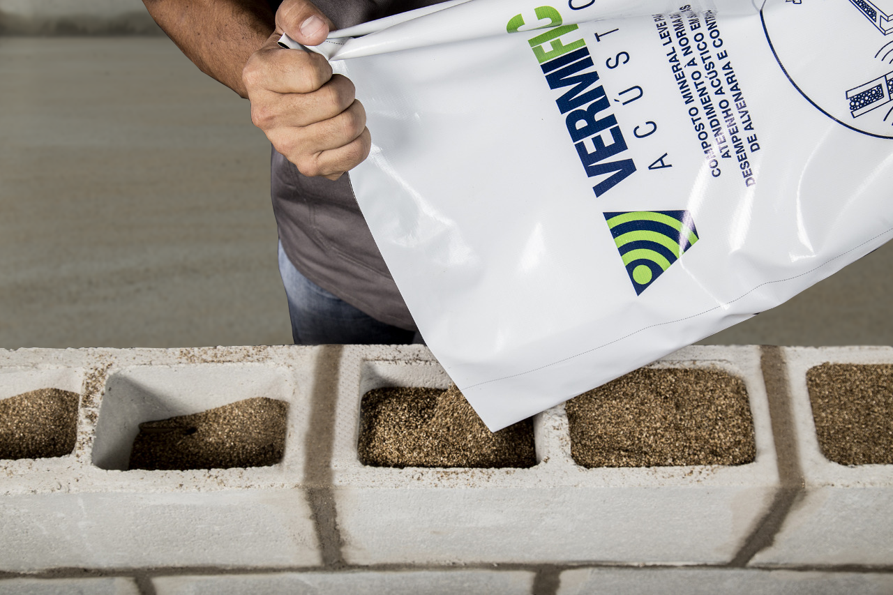 VERMIFLOC Acústico é uma solução simples e eficaz para isolamento sonoro de paredes. Ao ser aplicado diretamente no preenchimento dos espaços confinados dos blocos de alvenaria (seja cerâmico ou de concreto), o produto garante melhoria do desempenho acústico a fim de atender aos requisitos da NBR 15575.